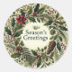 Añada un toque de elegancia a sus regalos de vacaciones, tarjetas y decoración con este pegatina redondo bellamente ilustrado con una corona festiva. El diseño muestra un arreglo exuberante de hojas huecas, pinecones, bayas y sprigs evergreen que rodean el texto "Saludos de temporada". Con su encanto rústico y detalles botánicos intrincados, este pegatina es perfecto para sobres de vacaciones, envolturas de regalo o artesanías de temporada. Celebra la calidez de la temporada con este diseño atemporal y versátil.