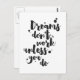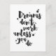 Postal inspiradora que muestra la frase "Los sueños no funcionan a menos que lo hagan" en un guión de pincel negro con una textura de tinta orgánica para lograr una auténtica apariencia con letras a mano.