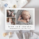 Un dulce anuncio de nacimiento de un collage de fotos de 3 fotos y una carta de agradecimiento con un simple tipo moderno y 3 fotos en la parte delantera. La parte posterior tiene un gran encabezado de nombre completo y un mensaje personal de la familia. Haga clic en el botón de edición para personalizar este diseño con sus fotos y detalles.