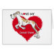 Que todos sepan que AMAN su Gran Danés (orejas sin cortar) con este gran corazón rojo y bailes saltando con el texto "I Love My Great Dane" de Danes-R-Us.