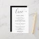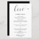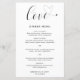 Carta boda con un diseño sencillo y minimalista con la palabra "amor" en una tipografía elegante con un corazón al final. Abajo está su menú en un sans serif moderno junto con sus nombres y fecha. Estos menús bodas baratos de estilo minimalista se imprimen en hojas de papel para una opción económica.