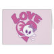 Calavera y huesos cruzados en un corazón rosado con texto de AMOR. Este es un cráneo de niñas adorable para mujeres y niños.