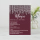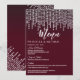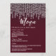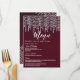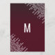 Elegantes, chic y glamurosas luces colgantes de diamante blancas sobre rojo granate, tarjetas de menú para recepción de boda. Este diseño clásico y sofisticado es perfecto para la recepción de boda elegante, con estilo y tendencia. Personalice con su propio menú en la parte frontal, junto con sus nombres y fechas. Luego personalice la parte trasera con la inicial de su monograma. Todo el diseño de impresión de foto.