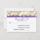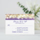 tarjeta de RSVP de boda azul y dorada con luces de cadena colgantes y fondo de textura de brillo de purpurina (no es purpurina real).