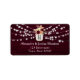 Elegante, moderna, etiqueta de dirección de regreso de boda de madera rústica burdeos con monograma en la parte superior, hermosas flores de acuarela en frasco de mason, luces de cadena y escritura de caligrafía de moda.