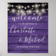 Con luces de cadena bonitas y nombres de estilo de firma, esta elegante señal de bienvenida rústica se puede personalizar con su información en letras elegantes sobre un fondo de paneles de madera morada. Diseñado por Thisisnotme©