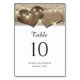 Tarjetas de número de mesa de campo rústico que presentan dos corazones de arpillera contra un fondo de arpillera y encaje adornado con luces de cuerda.