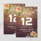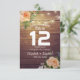 Plantillas de Tarjeta de Acompañamiento / Número de Mesa / Asiento de Boda - Elegante Letra Dorada con Rosas Florales Blancas y Melocotón y Luces de Cuerda en Fondo de Madera Rústica. Un Diseño Perfecto para tu Gran Día. ¡Todos los estilos de texto, colores y tamaños se pueden modificar para ajustarse a tus necesidades!