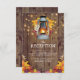 Tarjetas de recepción de boda campestre rústica con fondo de granero de madera, hojas de otoño, linterna con vela encendida, luces centelleantes y una plantilla de boda moderna.