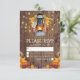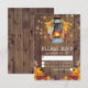Tarjetas de respuesta de boda campestre rústica con fondo de granero de madera, hojas de otoño, linterna con vela encendida, luces de hadas y una plantilla moderna de RSVP.