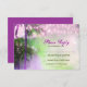 hermosa tarjeta RSVP de boda en playa púrpura oscura o boda de destino con una cadena de luces colgando de las palmeras.