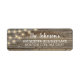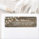 La etiqueta de dirección de vuelta rústica presenta impresión de madera oscura, luces de cuerda y superposición de tipografía blanca.