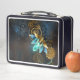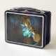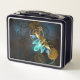 luciérnagas de vapor con alas transparentes azules y bombilla verde sobre fondo gastado, marrón y texturado. Estilo Steampunk.