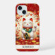 Make a statement with this iphone 15 phone case that features a Lucky Cat with gold coins and flowers around it on a red and gold background. It's modern yet traditional Japanese Maneki-neko is designed to attract good fortune, prosperity and customers into your business. The right paw raised brings money and wealth and the white cat symbolizes general happiness. It becomes uniquely yours with your name in a CAP font in black. Invite luck and prosperity into your life!
