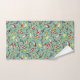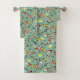 Este conjunto de toallas de baño incluye ilustraciones de señas de la pesca inspirados en los arcos de pesca de época en tonos rojos y amarillos sobre un fondo verde azulado pálido.