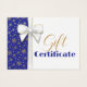 Lujoso y rico diseño de vacaciones con espléndidos Navidades regalo arco y dorados copos de nieve en un fondo azul. Este certificado de regalo es perfecto para su pequeña empresa o para regalar a amigos y familiares.