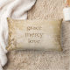 Vintage arrojar una mirada de almohada con proverbio cristiano —gracia, misericordia, amor. El fondo está desvanecido en el color oro antiguo.