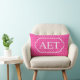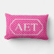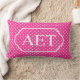 Perfeccione para un dormitorio o el sitio del dormitorio, esta almohada brillante y alegre ofrece un marco blanco alrededor de su opción de las letras griegas en un fondo rosado y blanco del lunar.