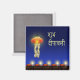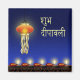 Feliz Ilustracion Diwali: Una brillante lámpara Diwali con diyas rojas (lámparas de aceite indias en forma de taza) con un borde ornamental sobre un fondo del cielo nocturno y el saludo escrito en sánscrito.