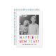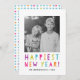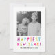 Celebra el próximo Año Nuevo enviando a tus amigos una brillante y alegre tarjeta de foto de vacaciones. La moderna tarjeta fotográfica de vacaciones incluye "Año Nuevo más feliz" en una tipografía moderna y colorida, marcadores de posición para tu foto y texto personalizado, y un elegante patrón multicolor en la parte posterior.