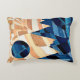 almohada acentuada con colores complementarios audaces y formas y texturas interesantes; una obra de arte abstracta que representa una luna azul y montañas contra un fuerte cielo naranja.