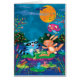 Artista: Elisa Chavarri | Racoon y conejito, rana y búho bailando en el estanque por la noche con una gran luna de otoño sobre ellos en el cielo