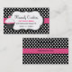 Tarjeta de visita bonita de la panadería hecha en un fondo blanco y negro del lunar, con una banda intrépida rosada, a través del centro, y un área de texto blanca afilada negra decorativa, en el frente. Los gráficos caprichosos de la magdalena rosada, blanca, y negra adornan el lado izquierdo, de la tarjeta. El texto es completamente adaptable adaptarse a sus necesidades del negocio. Grande para en casa los panaderos también.