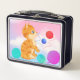 Casilla para el almuerzo con un gatito jugando con bolas de hilo de diferentes colores.