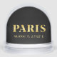 The chic snow globe with its elegant dome presents the geographical coordinates of Paris, France in shimmering gold letters, beautifully set against a deep ebony backdrop.