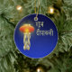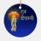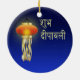 Feliz ilustracion Diwali: Una brillante lámpara Diwali sobre el fondo del cielo nocturno y el saludo escrito en sánscrito.