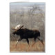 Tarjeta Bull Moose vertical. Un gran alce de toro atraviesa el arbusto en una zona de colinas de arena del sur de Alberta, Canadá. Moose parece estar fuera de lugar en este terreno seco y arenoso que tiene muy poca agua para sostener la vegetación acuática que se alimenta por lo general del alce.