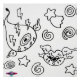 El negrita gráfico de la línea dibujada a mano negra y blanca tiene un globo ocular y labios flotando sobre las alas en el éter entre espirales y estrellas. Obra de MLO para Planet M13 shop.