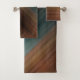 Set de toallas de baño equipamiento y decoración de mobiliario casero accesorio con diseño de arte del desierto pintado del suroeste, imagen de The FabricSeal en Zazzle. Este magnífico ilustracion de arte gráfico digital presenta una superficie de madera falsa, empapada en el aire y una acuarela pintada en capas horizontales con hermosos colores inspirados en los desiertos del magnífico suroeste. Colores en tonos negros, marrones, burdeos, rojos, rojos, rojos, terracota, ladrillo, marrón, arena, azul turquesa y verde.