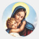 Esta preciosa representación de Madonna y Niño es una de nuestras favoritas personales. La hermosa Virgen María tiene un halo y está vestida con túnicas azules y rojas. El niño de Cristo está sentado en el regazo de la Virgen Madre y tiene su brazo alrededor de ella. Él tiene un poco de halo propio. Detrás de ellos hay cielos azules y nubes. Una Madonna verdaderamente especial y un pegatina infantil.