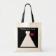 Esta madre de la bolsa de tote de novia muestra las palabras "Madre de la novia" encima de un vestido moderno de novia y un ramo rosa de rosas con un fondo negro. Una gran manera de agradecerle a su madre. Derechos de autor Kathy Henis