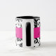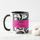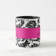 Esta taza blanco y negro elegante del damasco con una banda de las rosas fuertes hace juego la invitación del boda mostrada abajo y se modifica para requisitos particulares para la madre de la novia. Haría un recuerdo agradable para su mamá. El texto es adaptable, y usted puede elegir de una variedad de estilos y de tamaños de la taza.