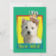 Invite a sus huéspedes con esta tarjeta de felicitación del oeste caprichosa del perro de Terrier de la montaña. ¡Con una magdalena equilibrada en ella es la cabeza, este diseño está seguro de traer una sonrisa y ríe nerviosamente! El BTW, este diseño tiene varias versiones, con diversos colores de fondo. Hay también una versión del feliz cumpleaños.