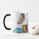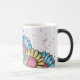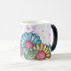Diseño de verano de amor en una taza. Estilo retro que se remonta a los años 60: flor, minifaldas y los Beatles.
