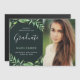 Personalizado asequible imprimió invitaciones de foto de graduación magnética. Este moderno diseño cuenta con un elegante guión de caligrafía y ramas botánicas acuarelas. Personalice el diseño con su foto personalizado, nombre, fecha de graduación. Ideal para un fiesta de educación media, secundaria, secundaria o universitaria. Utilice las herramientas de diseño para elegir cualquier color de fondo, cambiar los tipos de letra y colores del texto y crear su propio diseño único.