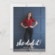 Esta moderna y moderna invitación de graduación muestra la foto del graduado, con una tipografía de escritura blanca que dice "ella lo hizo".