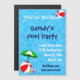 Una piscina personalizado o una plantilla de imán de invitación a la fiesta en la playa con un divertido tema de la piscina, letras frías en azul y blanco, decoradas con una bola de playa roja, paraguas verdes, sandalias y aceite de sol sobre un fondo azul acuoso con olas onduladas. Haga clic en Personalizar para cambiar fuentes o colores, incluso para guardar el diseño más adelante.