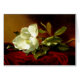"Una sola Magnolia sobre terciopelo rojo" pintada por Martin Johnson Heade; aceite sobre lienzo; Colección privada. Martin Johnson Heade, 1819-1904, fue un prolífico pintor norteamericano conocido por sus paisajes de marismas saladas, paisajes marinos, retratos de aves tropicales y aún vitales. Su estilo de pintura y su temática, si bien se derivan del romanticismo de la época, son considerados por los historiadores del arte como un alejamiento significativo del de sus pares.