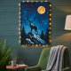 A reindeer posed atop a mountain, silhouetted against a night sky.