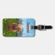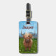 La etiqueta de equipaje de Cute Animal Parade World Heads and Tails Highland Cow es perfecta para viajeros amantes de los animales de todas las edades. Nuestra obra de arte animal incluye una adorable vaca marrón y marrón con un trozo de pelo rubio que cubre un ojo y enormes cuernos curvados que suben a un cielo azul salpicado de salpicaduras. En la parte de atrás encontrarás su lado de la cola. Está parada en un campo de tierras altas de vegetación, con flores blancas y montañas nevadas en el fondo. Esta divertida vaca peluda, o como la llaman los lugareños, ¡Hairy Coos seguramente traerá sonrisas!