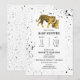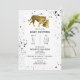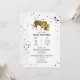 Invitación a una ducha de bebé con un ilustracion de un bebé y una madre tigre rodeados de una mancha de pintura negra sobre fondo blanco.