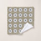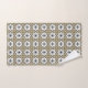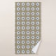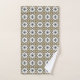"Dos imágenes de toallas decorativas con patrones florales geométricos en beige, blanco y negro. La primera muestra toallas colgadas; la segunda, una toalla doblada."