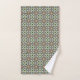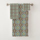 Toalla y paño con patrones circulares intrincados en verde, blanco y marrón en una percha y superficie, creando un aspecto decorativo y coherente.