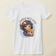 Esta encantadora camiseta muestra el ilustracion de una persona sosteniendo suavemente un perro naranja con ojos grandes y expresivos. La frase "MANEJAR CON CUIDADO" se muestra de forma destacada sobre la imagen, enfatizando el mensaje de ternura y cuidado de los animales. El fondo azul claro con las nubes aporta un toque de tranquilidad al diseño.