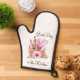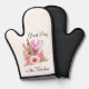 Diseño de flores rosas y utensilios de cocina rosas en guante de horno y protector de olla. Personaliza las palabras.