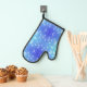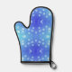 Front and back views of an oven mitt. The front is blue with white polka dots, and the back is silver with a quilted pattern. Black trim outlines both sides.